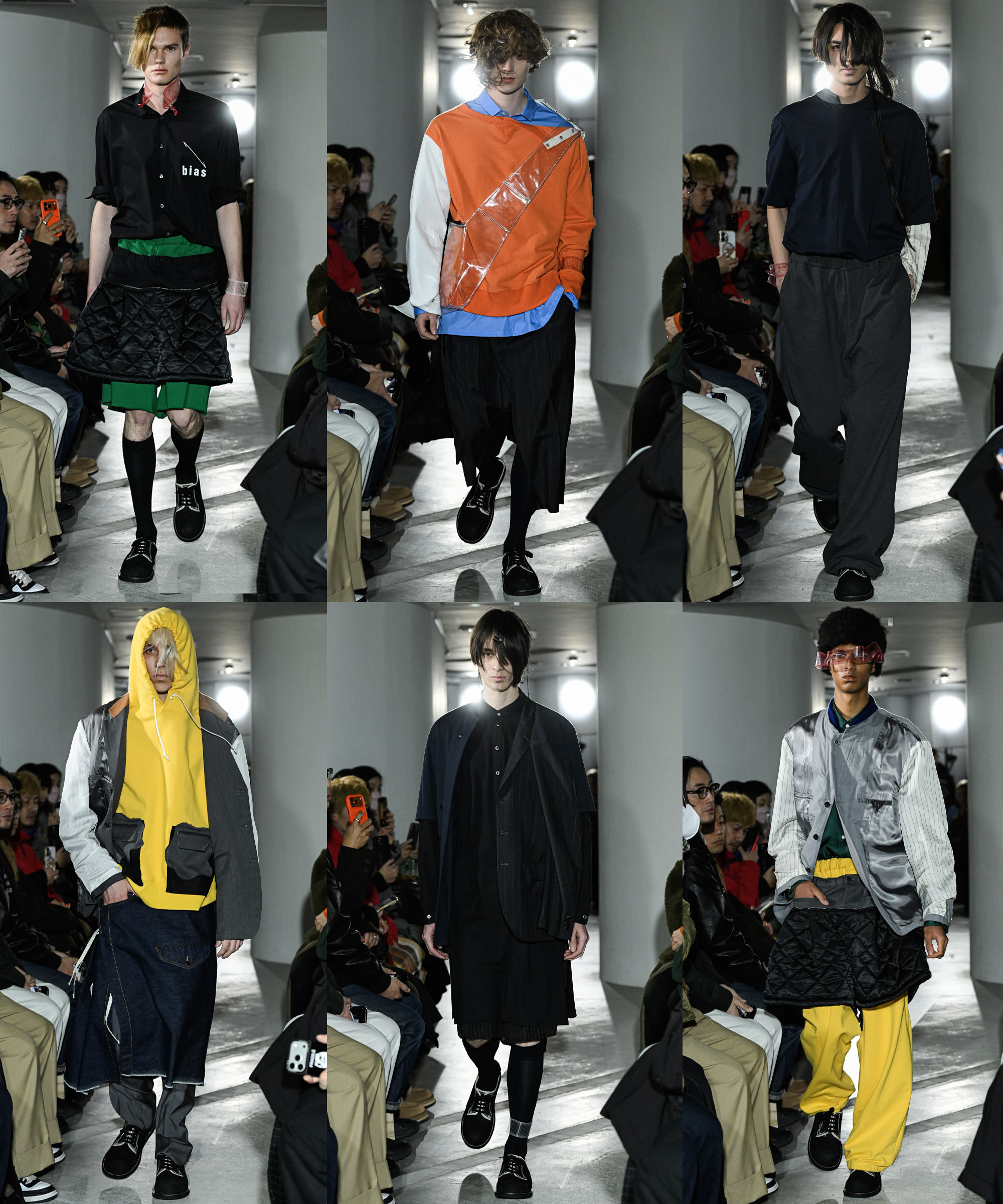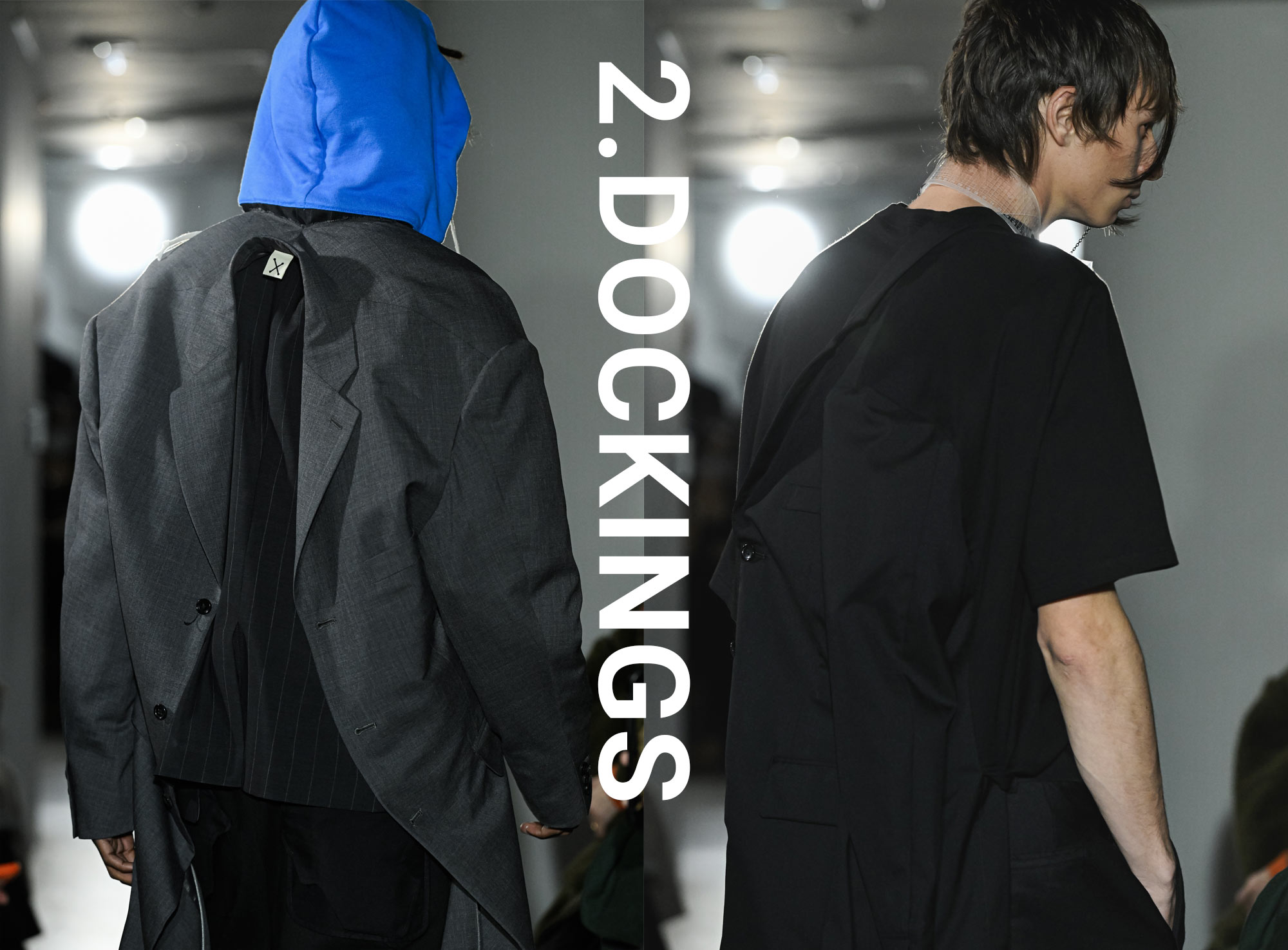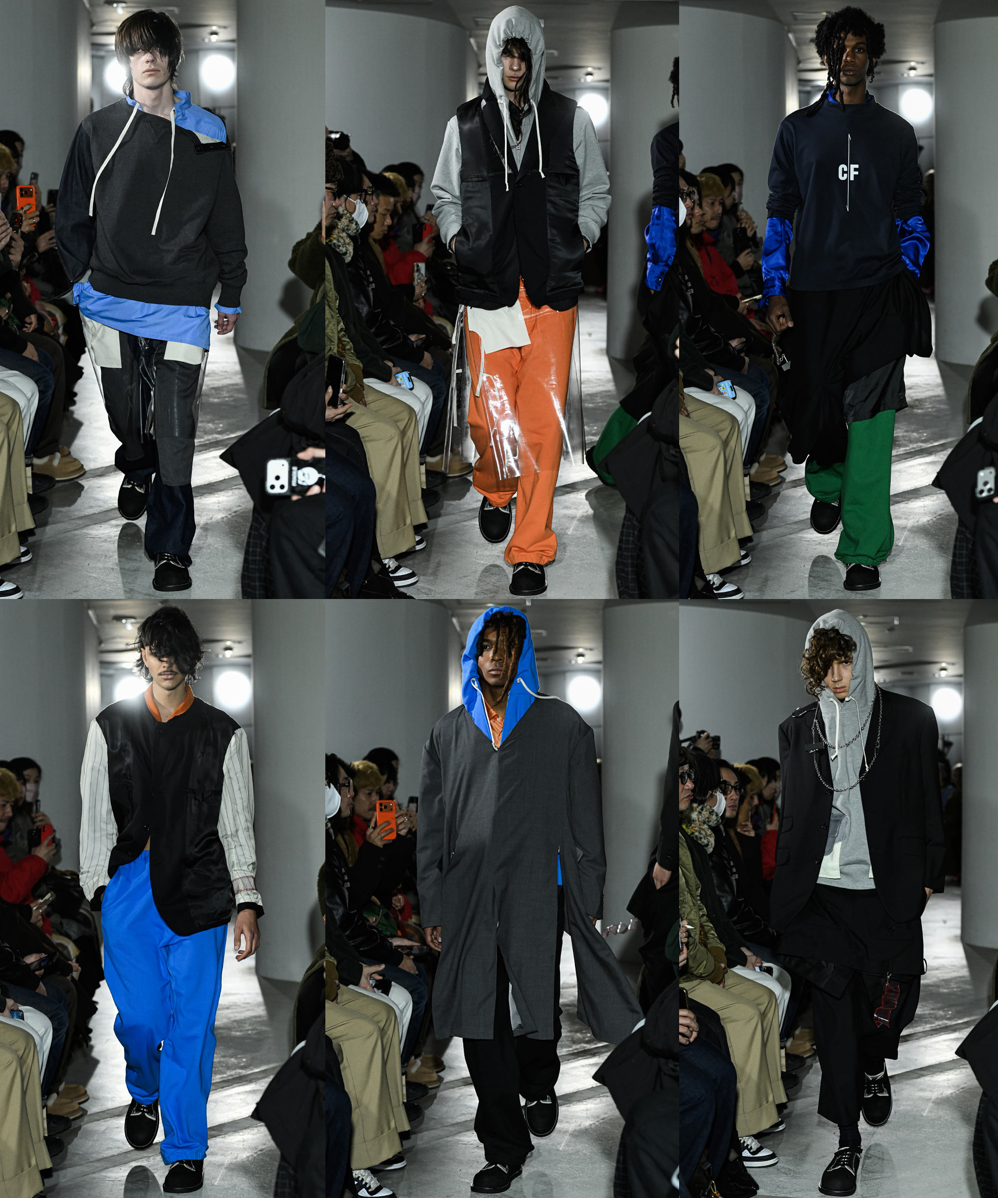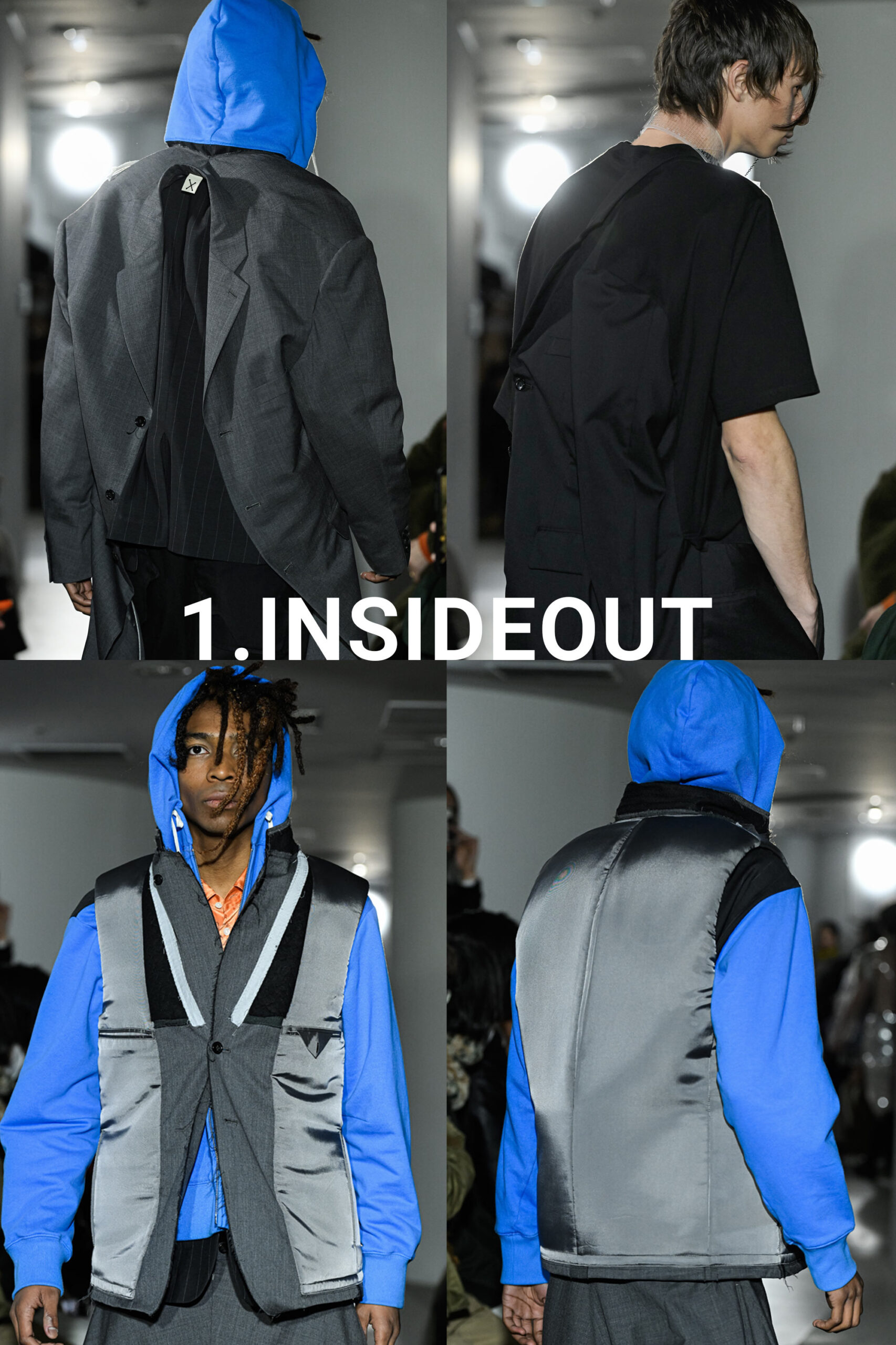 Centered on the fundamentals of men’s formalwear such as tailoring, shirts, and trousers, the collection introduced new viewpoints and value through inside out constructions and distinctive cutting. Details included T shirts combined with jacket elements at the back and tailored liners reworked as visible design features, reflecting techniques unique to a designer with a pattern making background. Colorful hoodies and accents in PVC added contrast and rhythm to the otherwise structured silhouettes.
