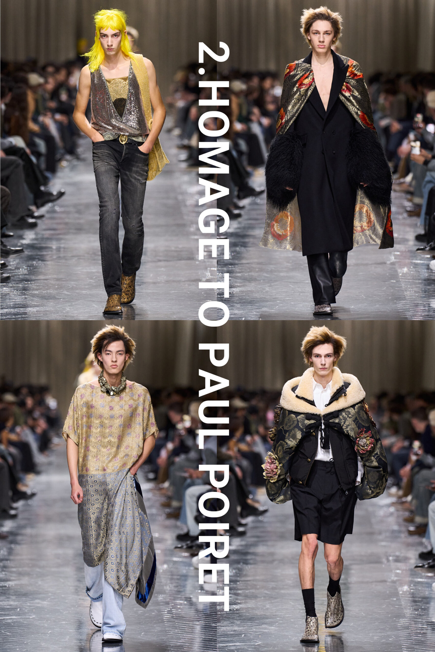 The starting point of this season’s collection was the modern flâneur roaming the streets of Paris. These Aristo youth figures, contemporary bourgeois youths, wander the city without destination before arriving in front of the Dior boutique on Avenue Montaigne, where they discover a small monument inscribed with the name Paul Poiret. This narrative was woven into the creative vision of the collection.