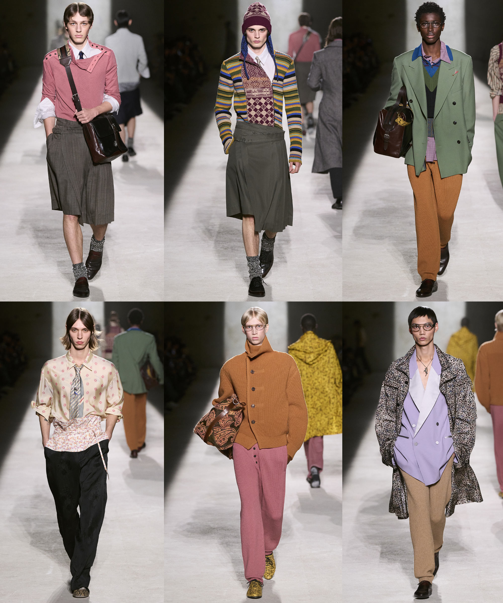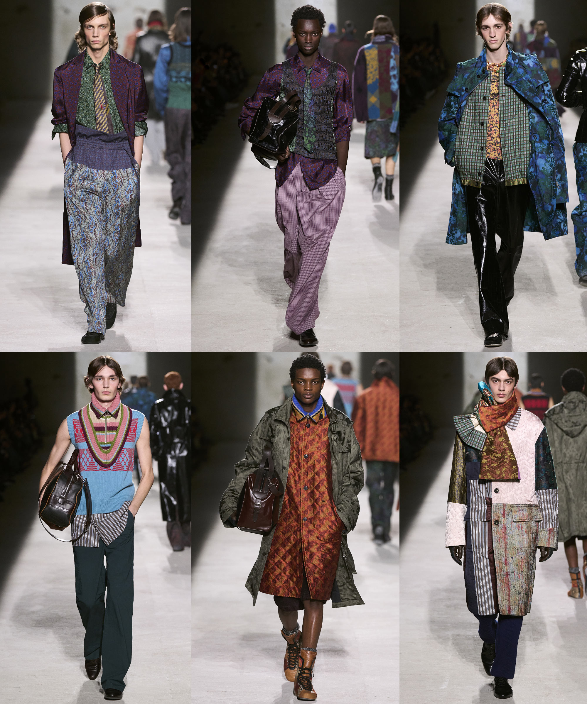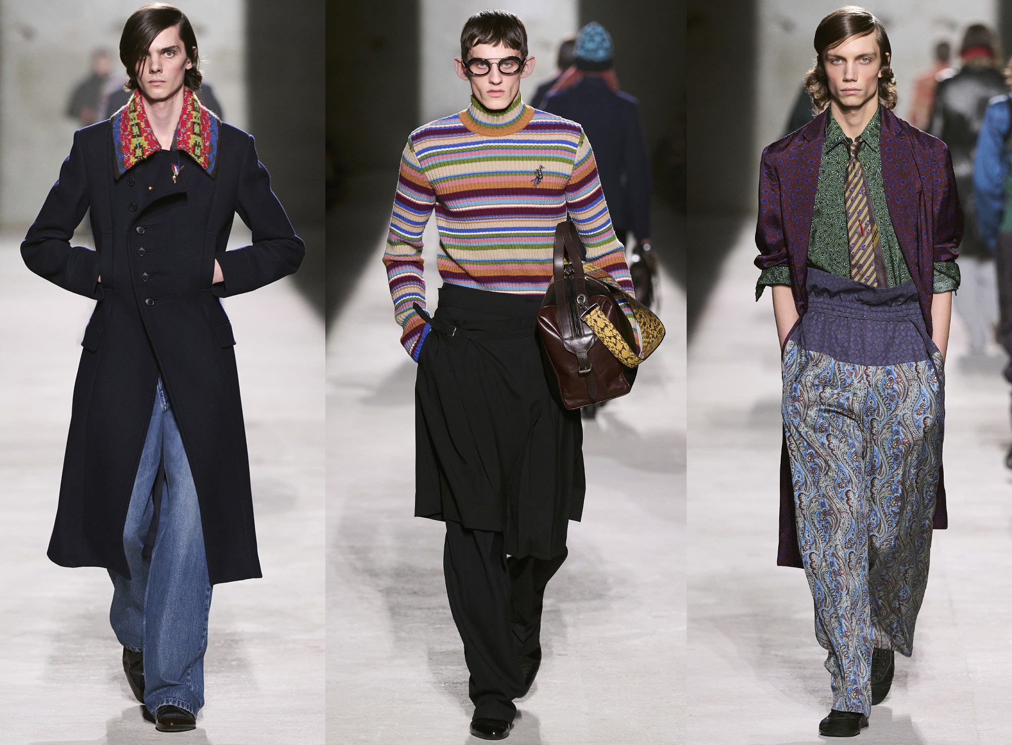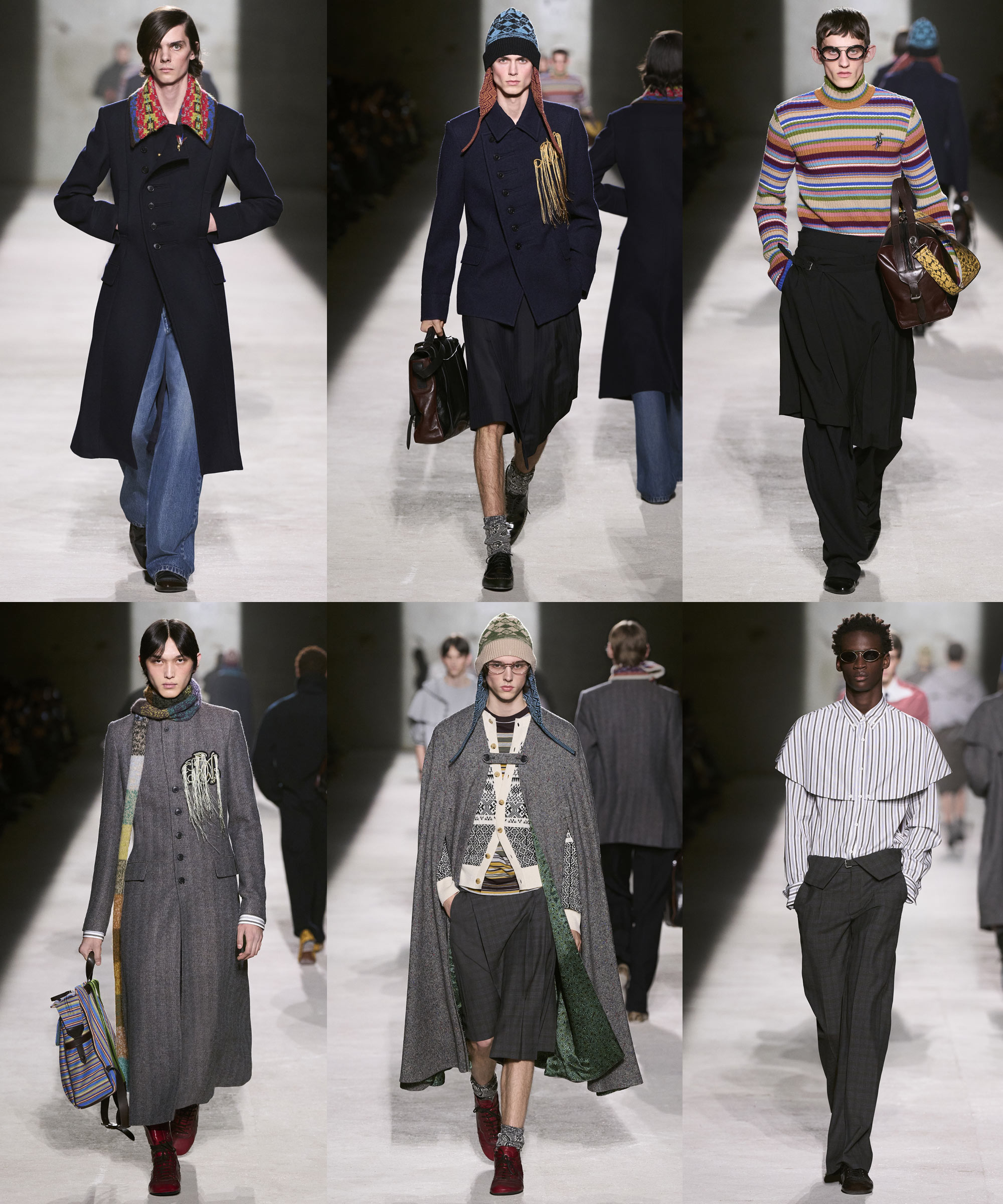 The primary source of inspiration was the wardrobe of these young men. Classically tailored long pencil coats, capes and capelets reminiscent of school uniforms, and Fair Isle and cable knitwear were gathered not only from their own clothing but also from pieces passed down through family members, conveying a sense of nostalgia and warmth. Preppy elements were subtly scattered throughout everyday styling, from ties and scarves to boxing shoes and laundry bags. At the same time, the layering of textures and patterns clearly carried the house’s codes, achieving a refined balance between individual identity and the brand’s heritage.