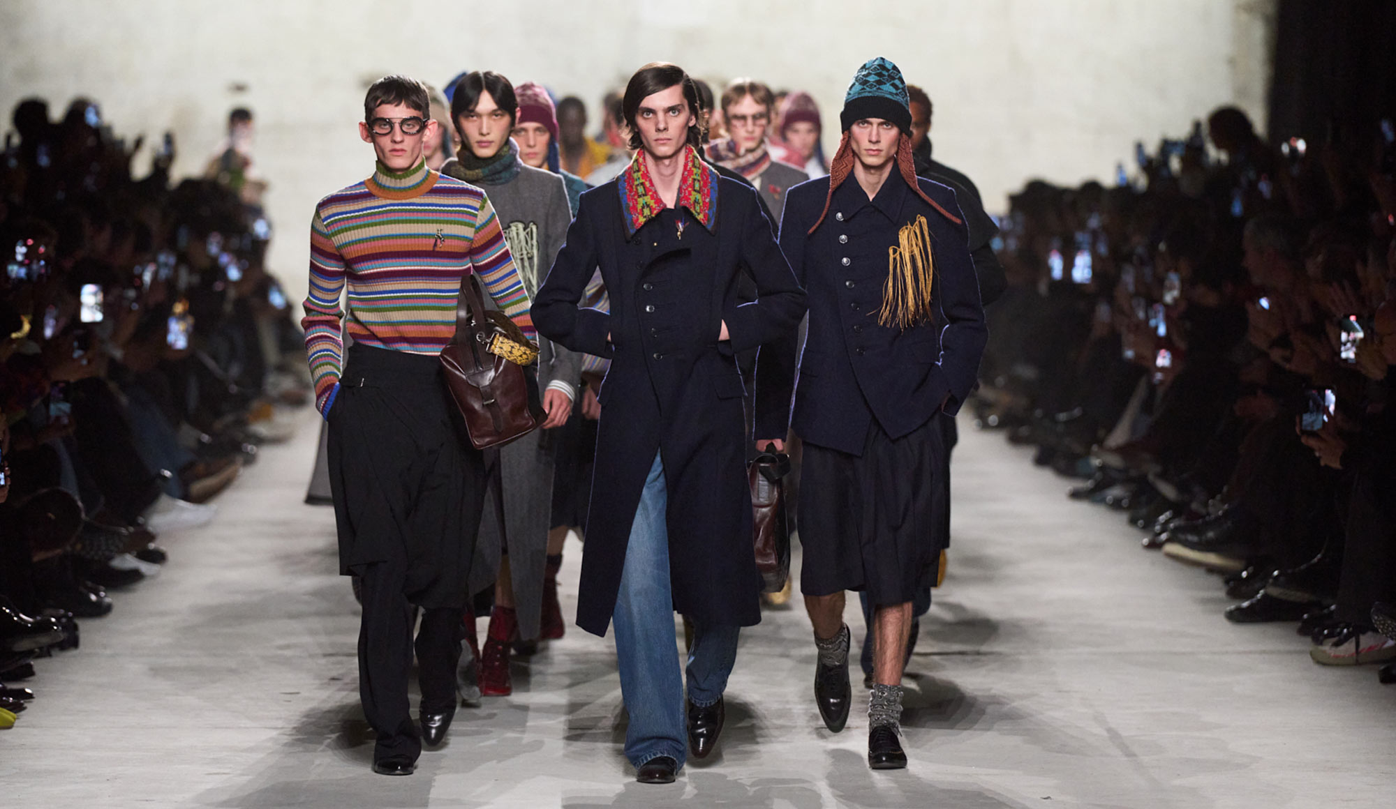 The primary source of inspiration was the wardrobe of these young men. Classically tailored long pencil coats, capes and capelets reminiscent of school uniforms, and Fair Isle and cable knitwear were gathered not only from their own clothing but also from pieces passed down through family members, conveying a sense of nostalgia and warmth. Preppy elements were subtly scattered throughout everyday styling, from ties and scarves to boxing shoes and laundry bags. At the same time, the layering of textures and patterns clearly carried the house’s codes, achieving a refined balance between individual identity and the brand’s heritage.