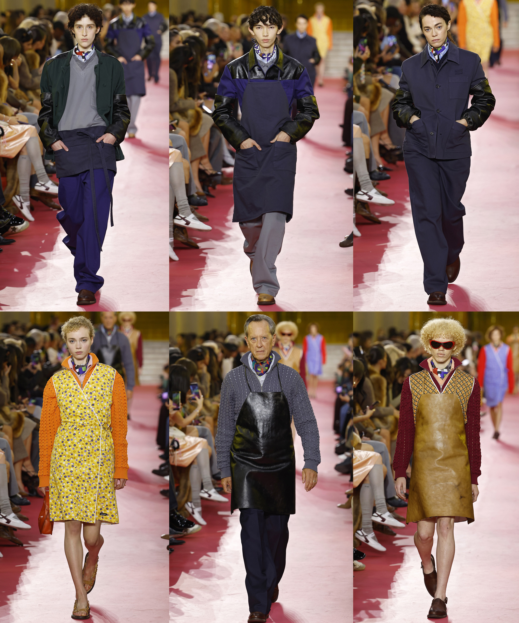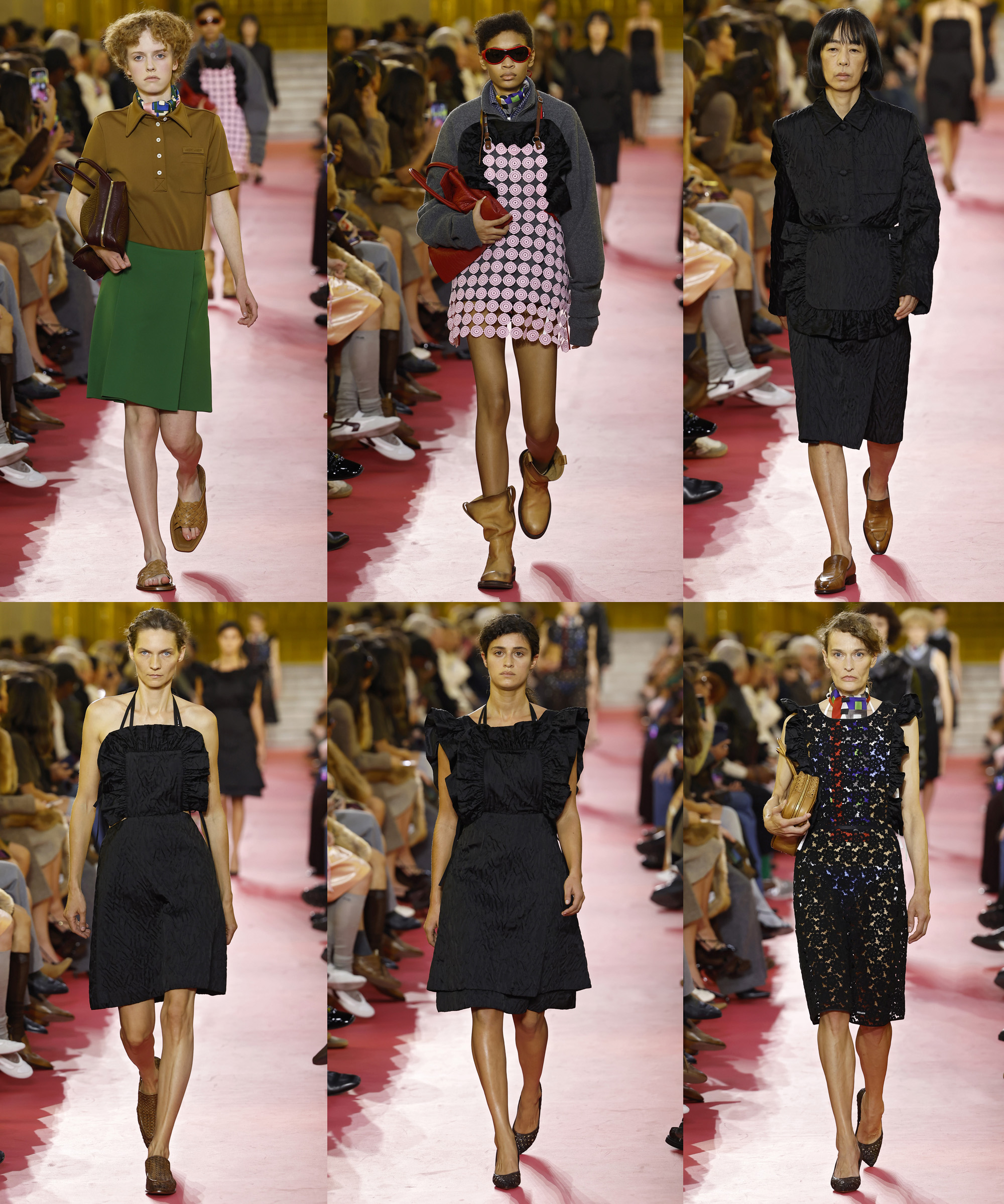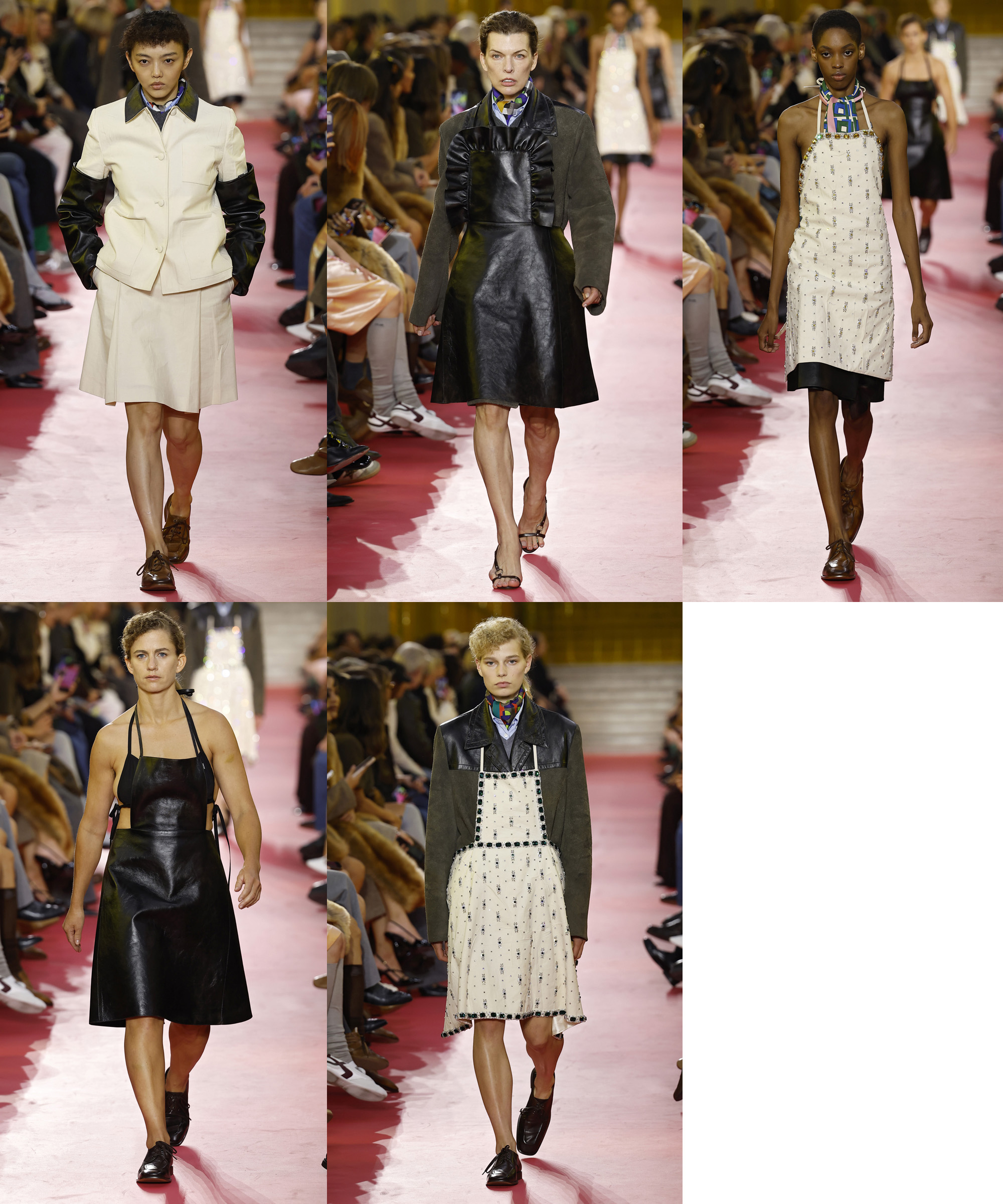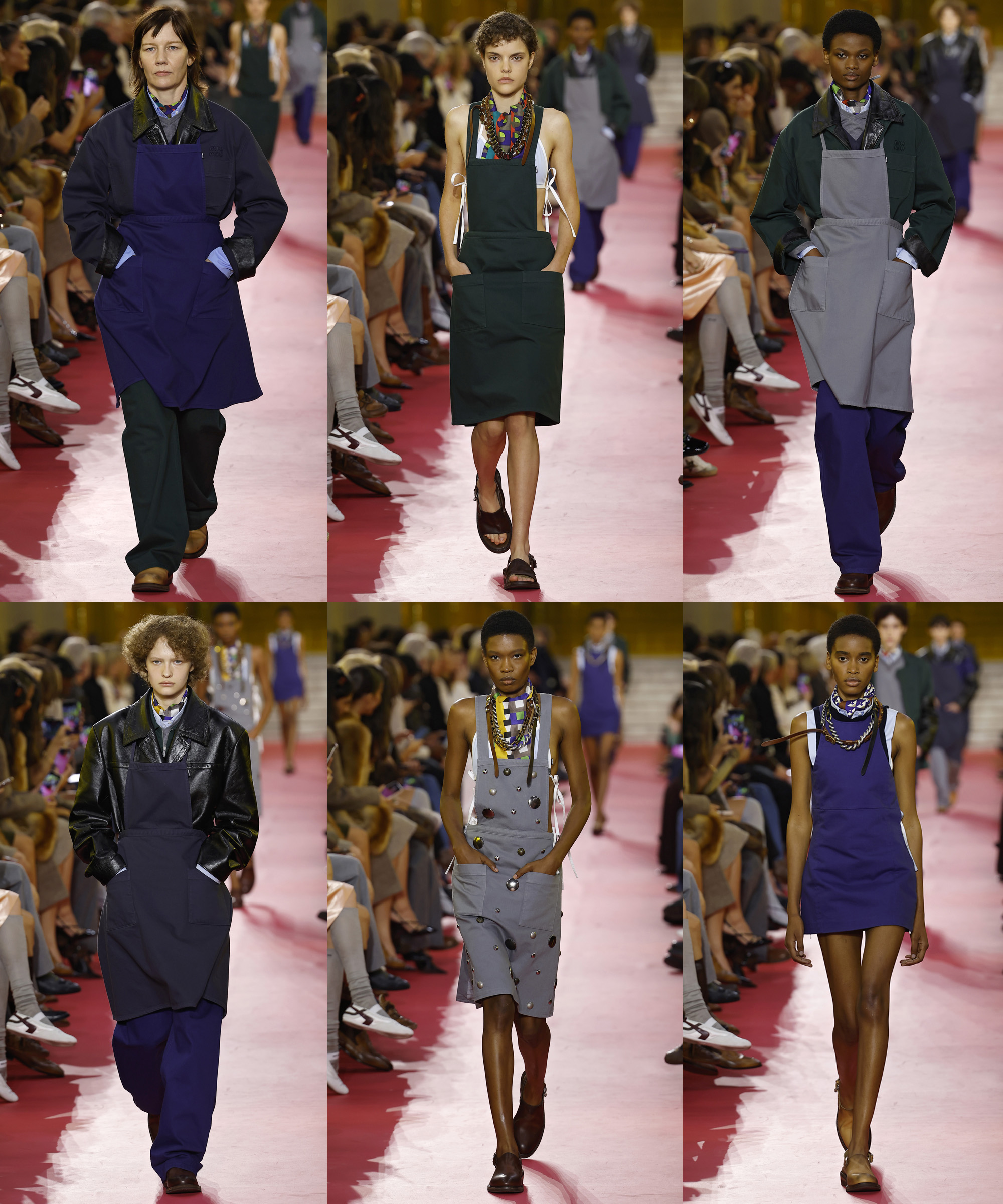 Titled “AT WORK,” the collection reexamines the dignity of labor through the lens of women’s work and pride. Aprons serve as a central motif, blending diverse roles and attributes into a single garment. The brand’s intellectual, philosophical approach elevates work into a form of beauty.
