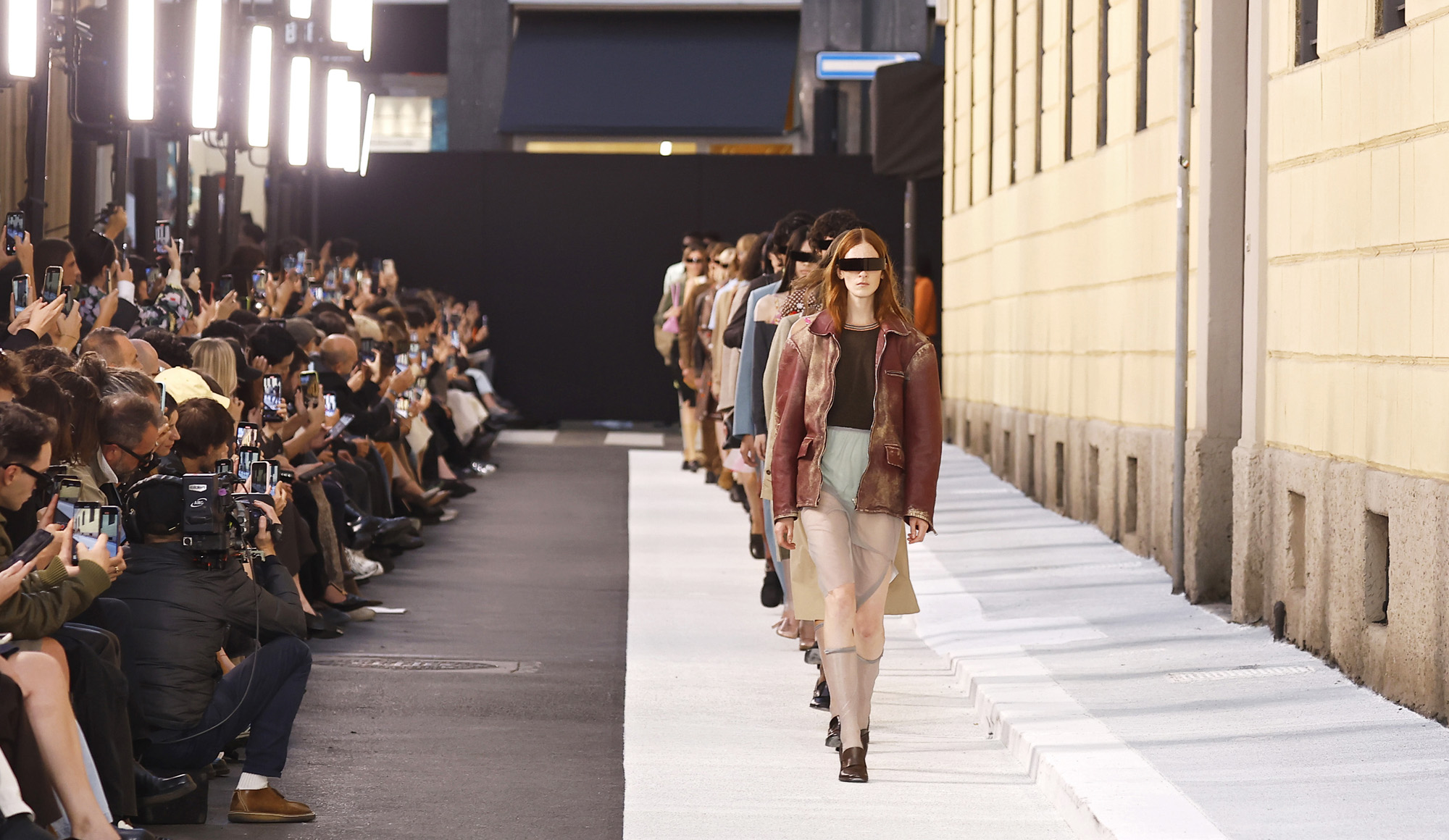 The street was transformed into a catwalk, painted white to evoke the feel of a “street” and reflect the brand’s idea of “heightened normality” The collection evoked a retro mood, while twisted details and unexpected material pairings elevated it into high fashion. Whimsical accessories, such as mismatched loafers and futuristic sunglasses, added a playful touch.