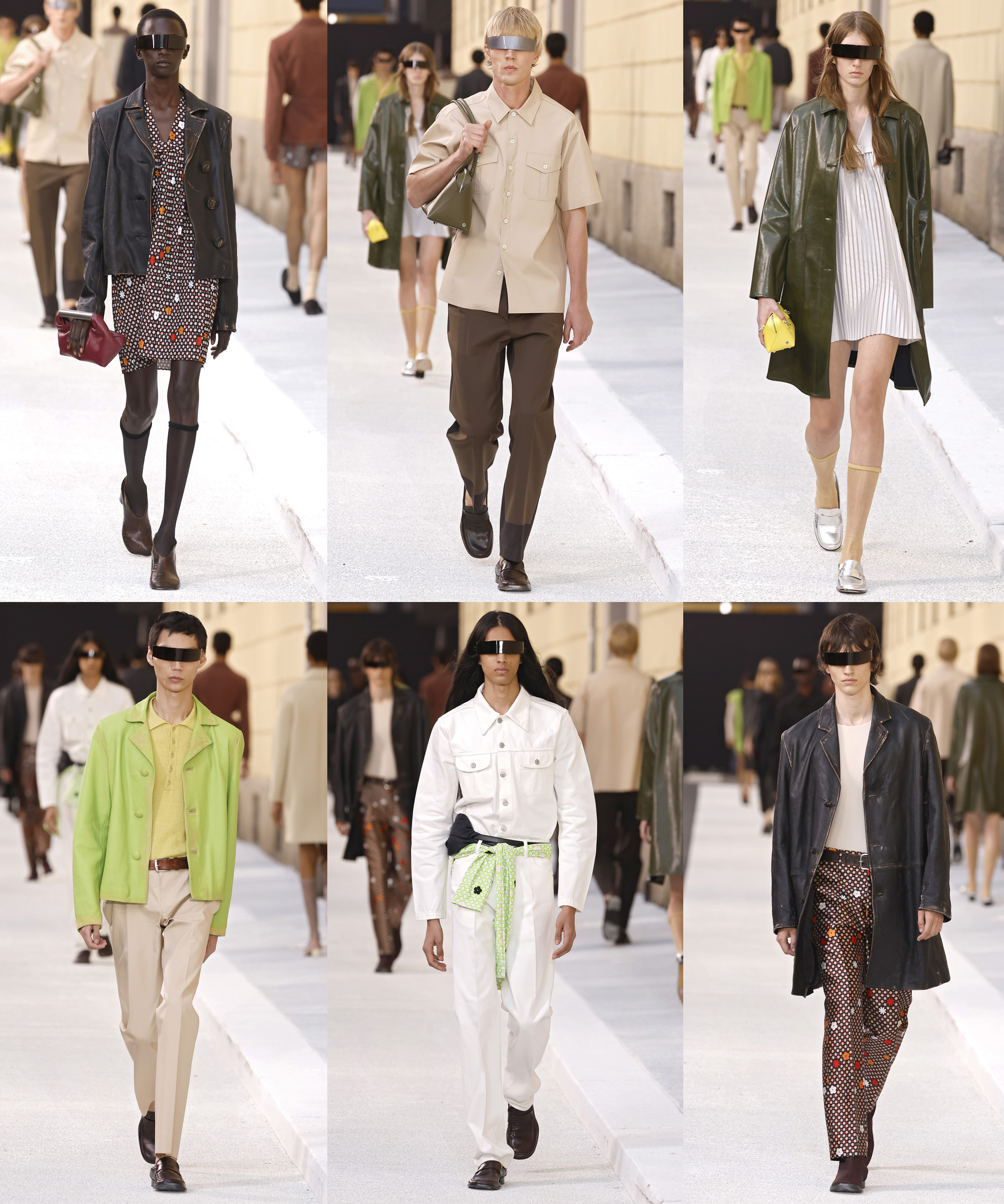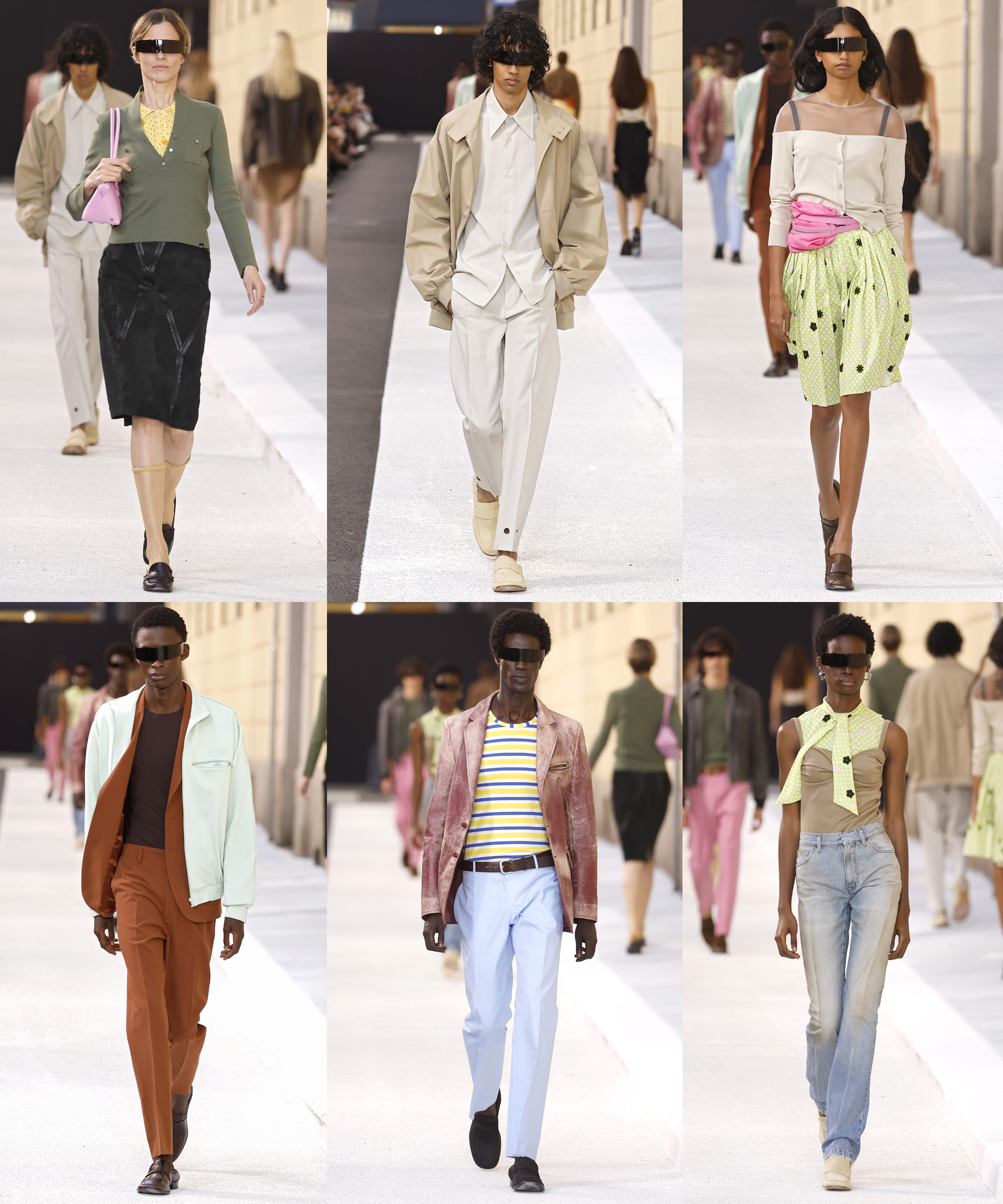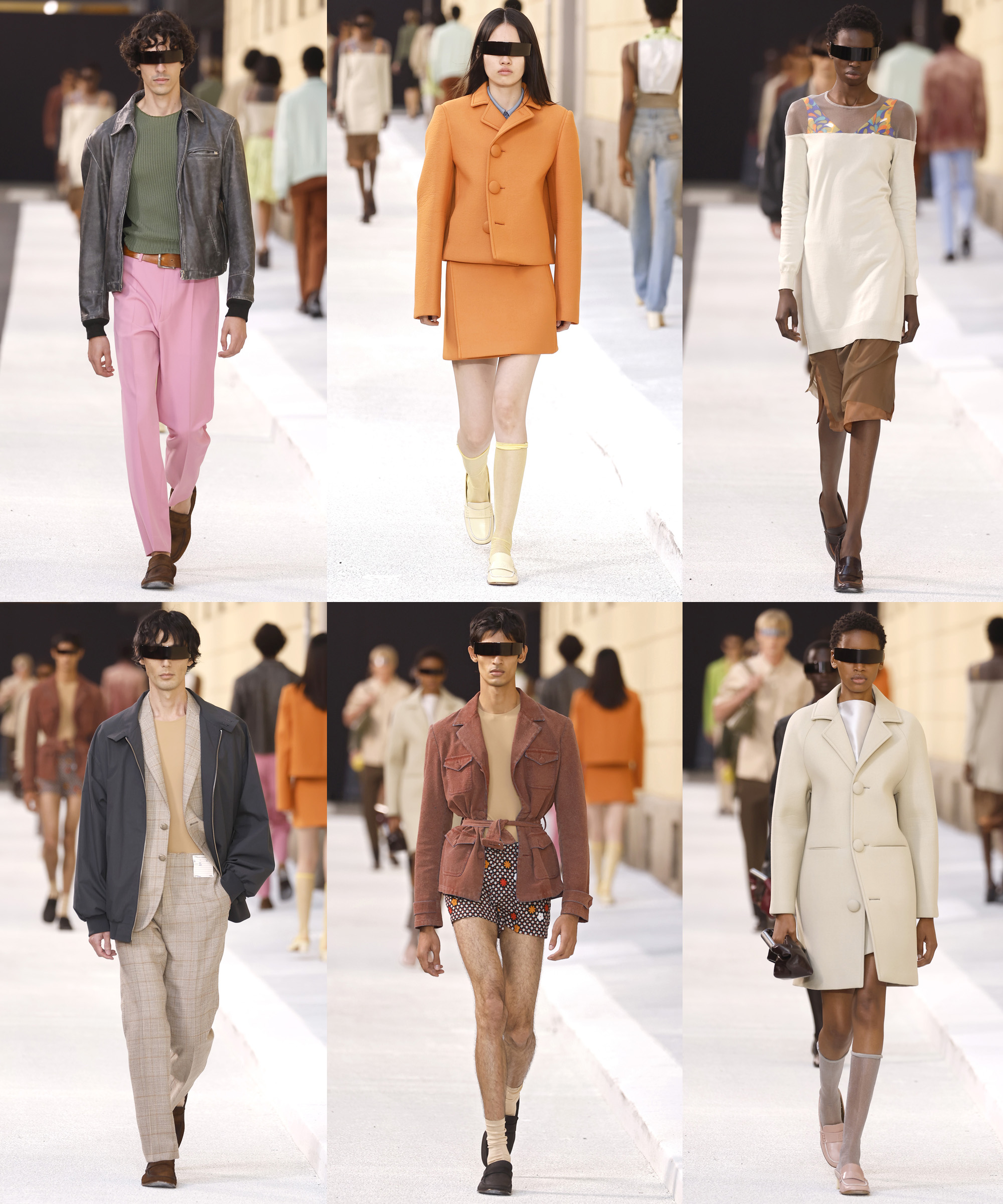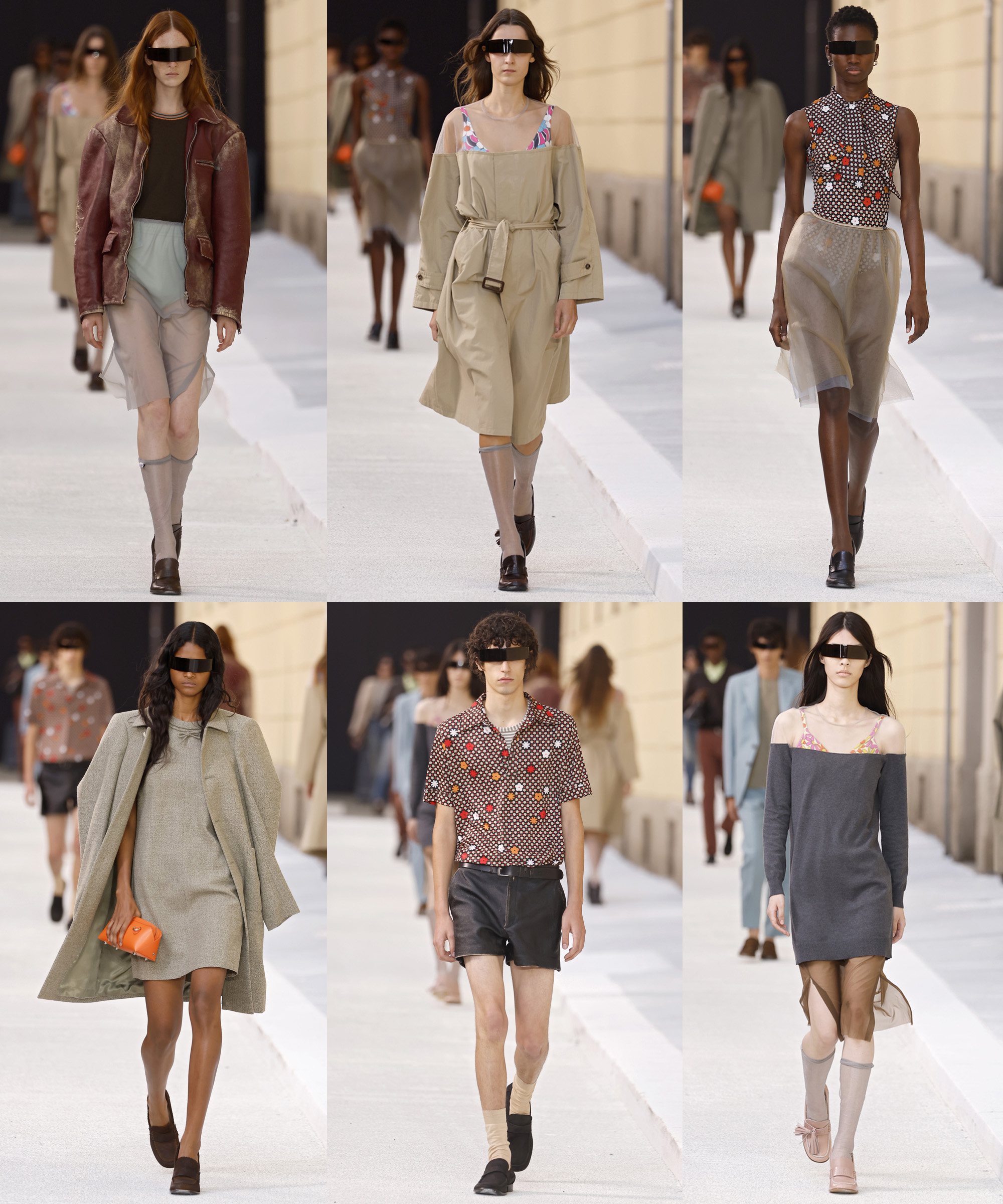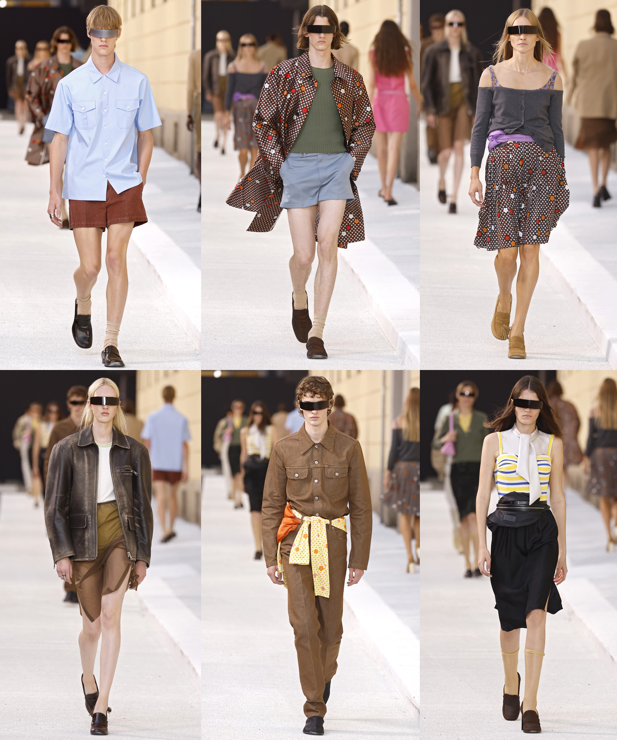 The street was transformed into a catwalk, painted white to evoke the feel of a “street” and reflect the brand’s idea of “heightened normality” The collection evoked a retro mood, while twisted details and unexpected material pairings elevated it into high fashion. Whimsical accessories, such as mismatched loafers and futuristic sunglasses, added a playful touch.