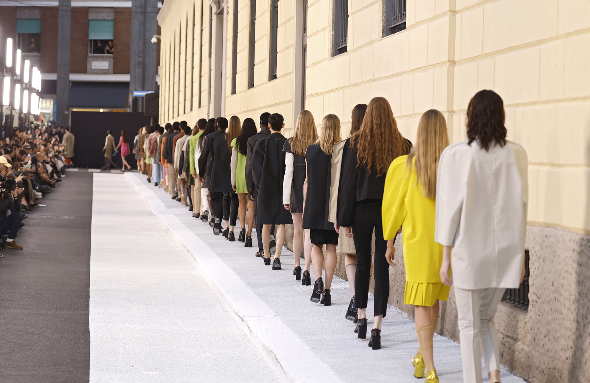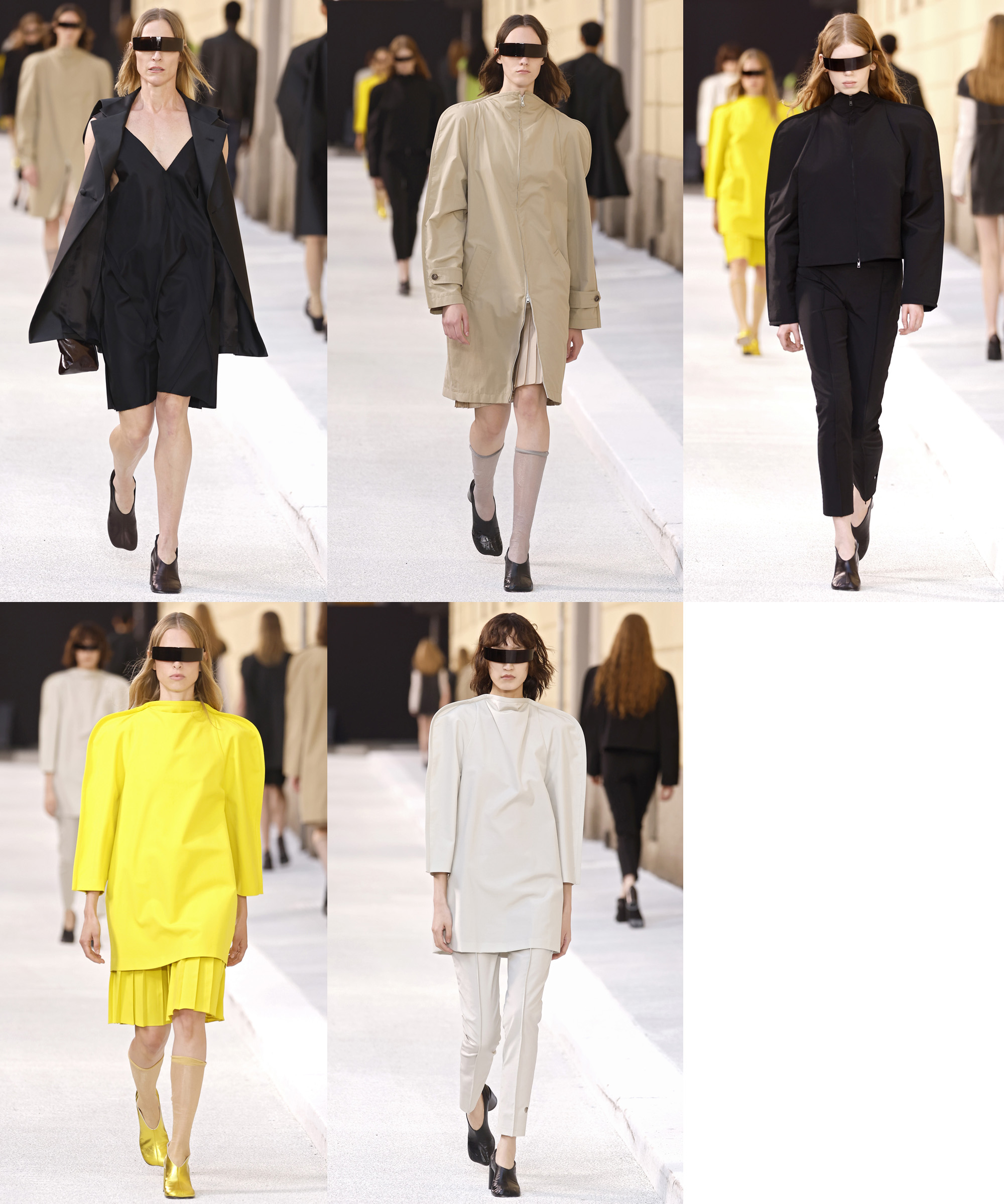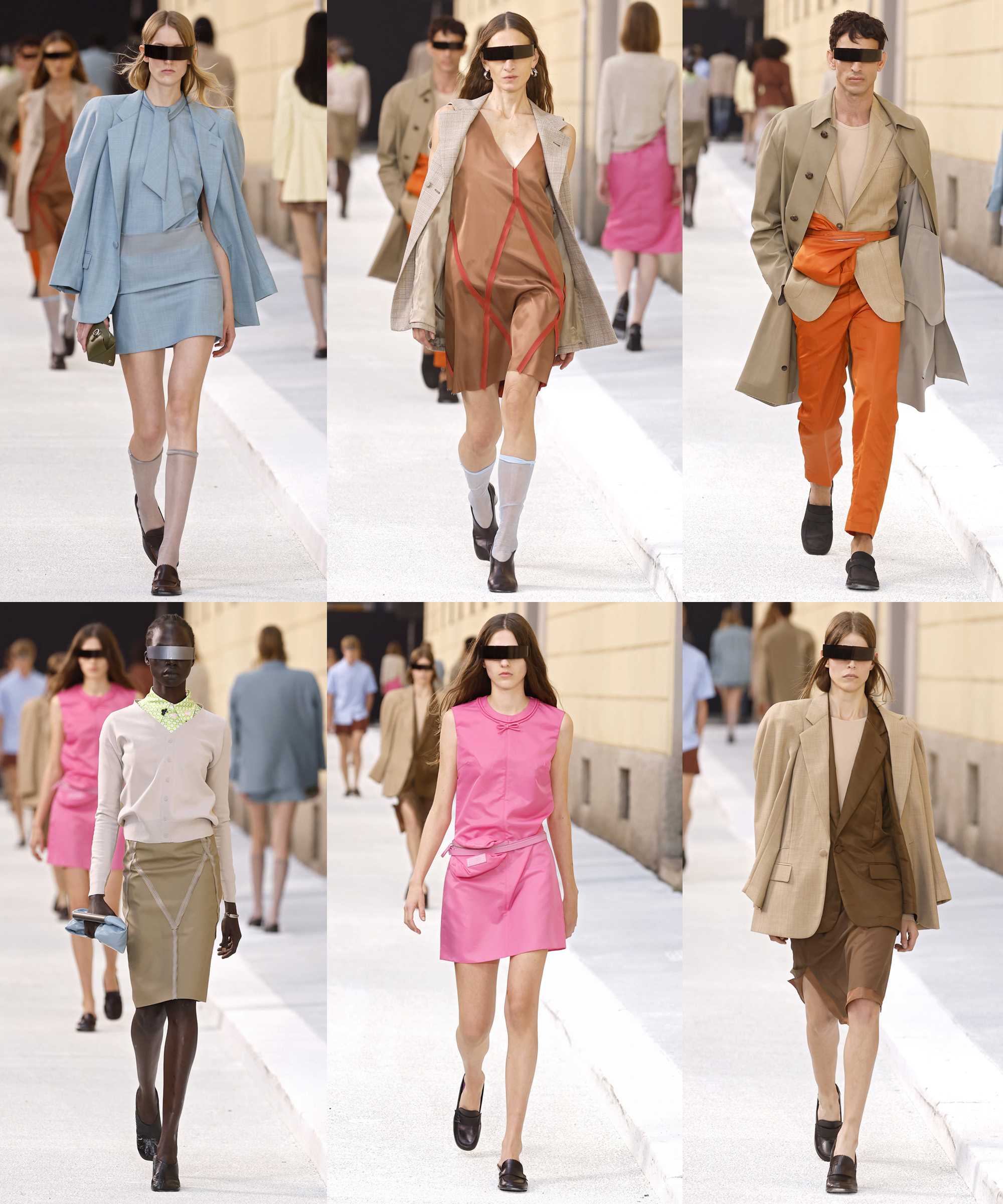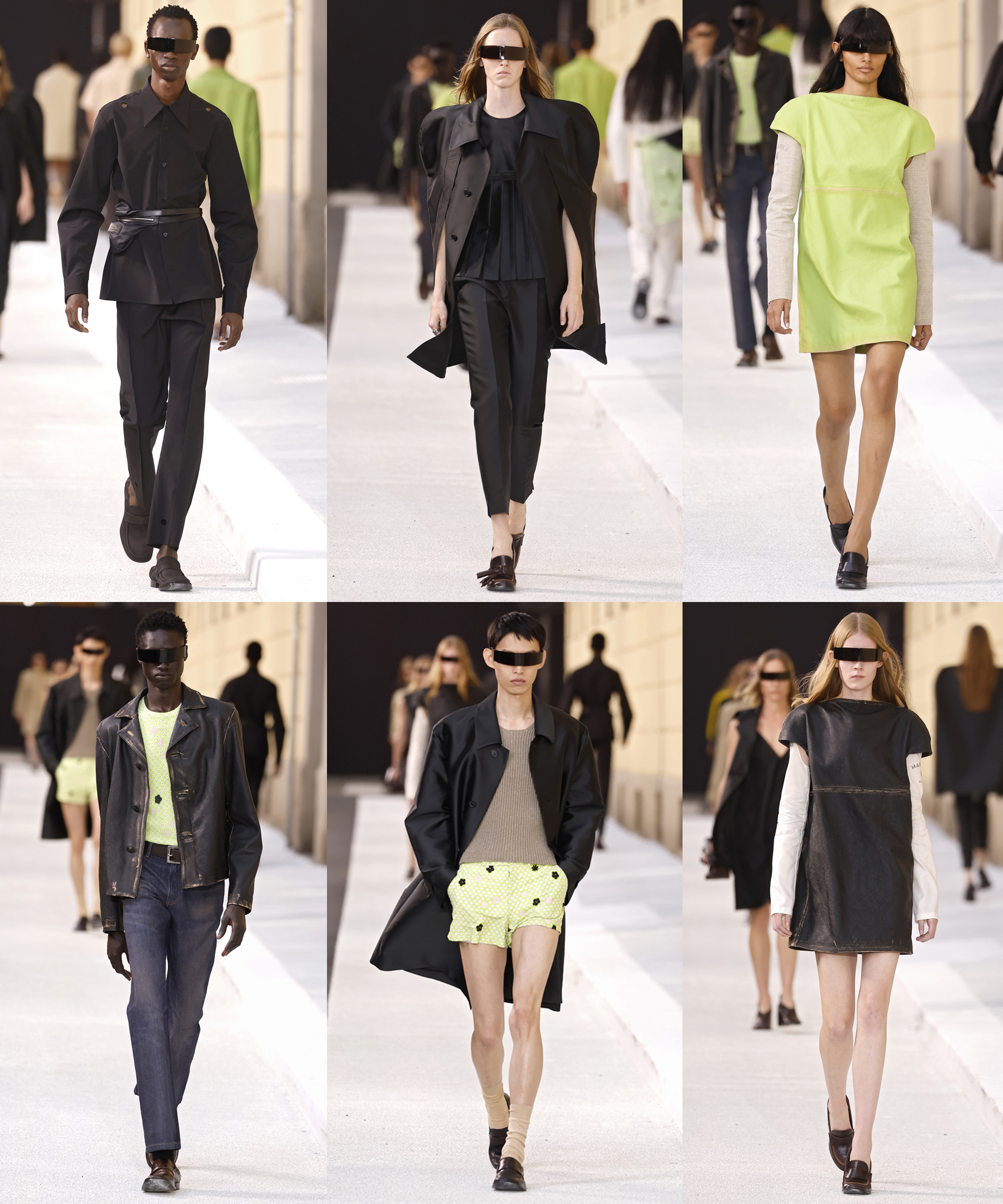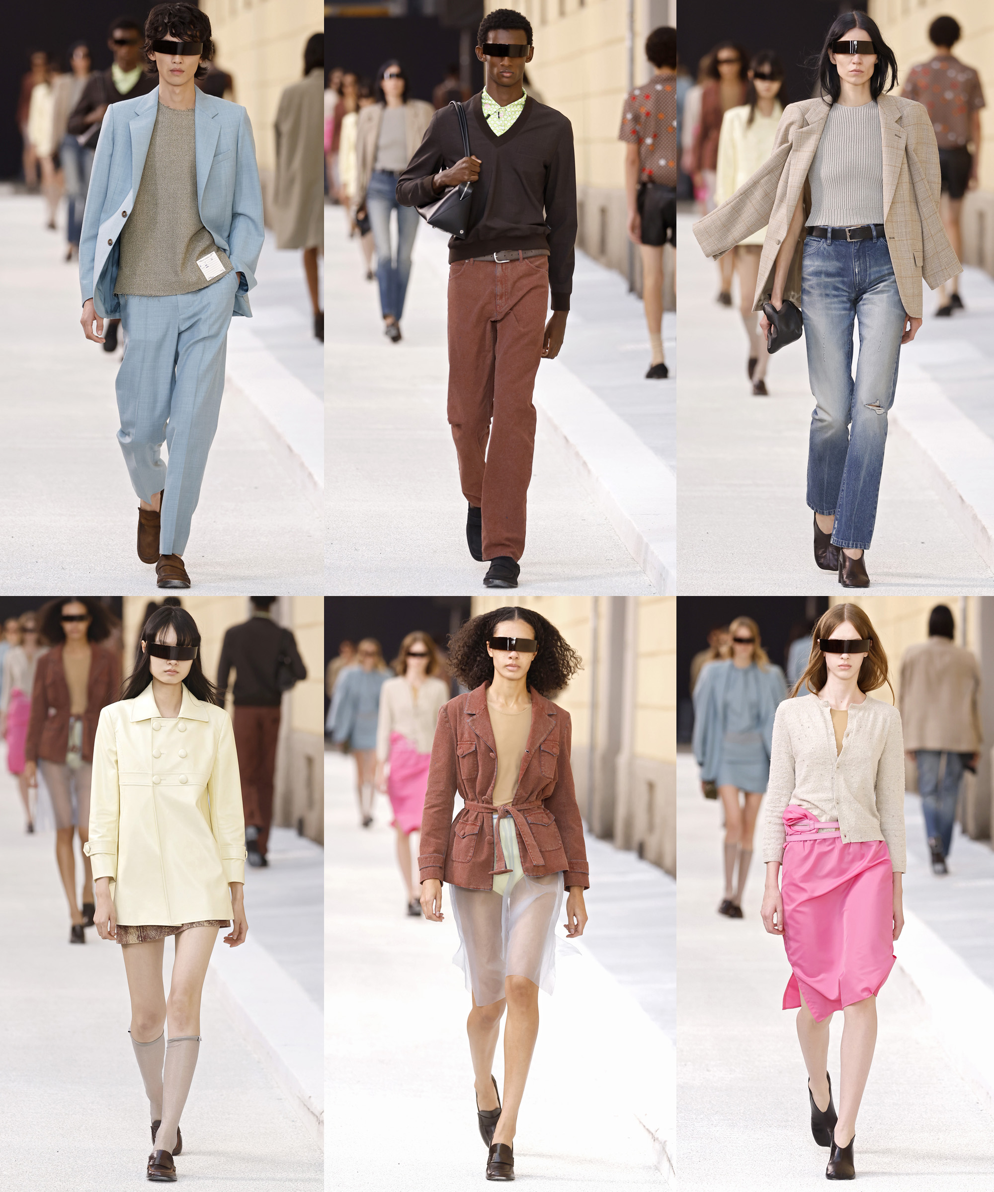 The street was transformed into a catwalk, painted white to evoke the feel of a “street” and reflect the brand’s idea of “heightened normality” The collection evoked a retro mood, while twisted details and unexpected material pairings elevated it into high fashion. Whimsical accessories, such as mismatched loafers and futuristic sunglasses, added a playful touch.