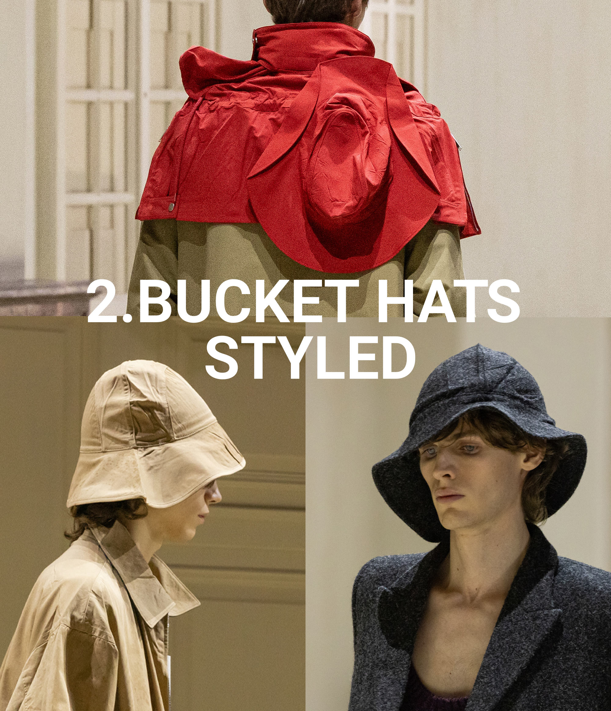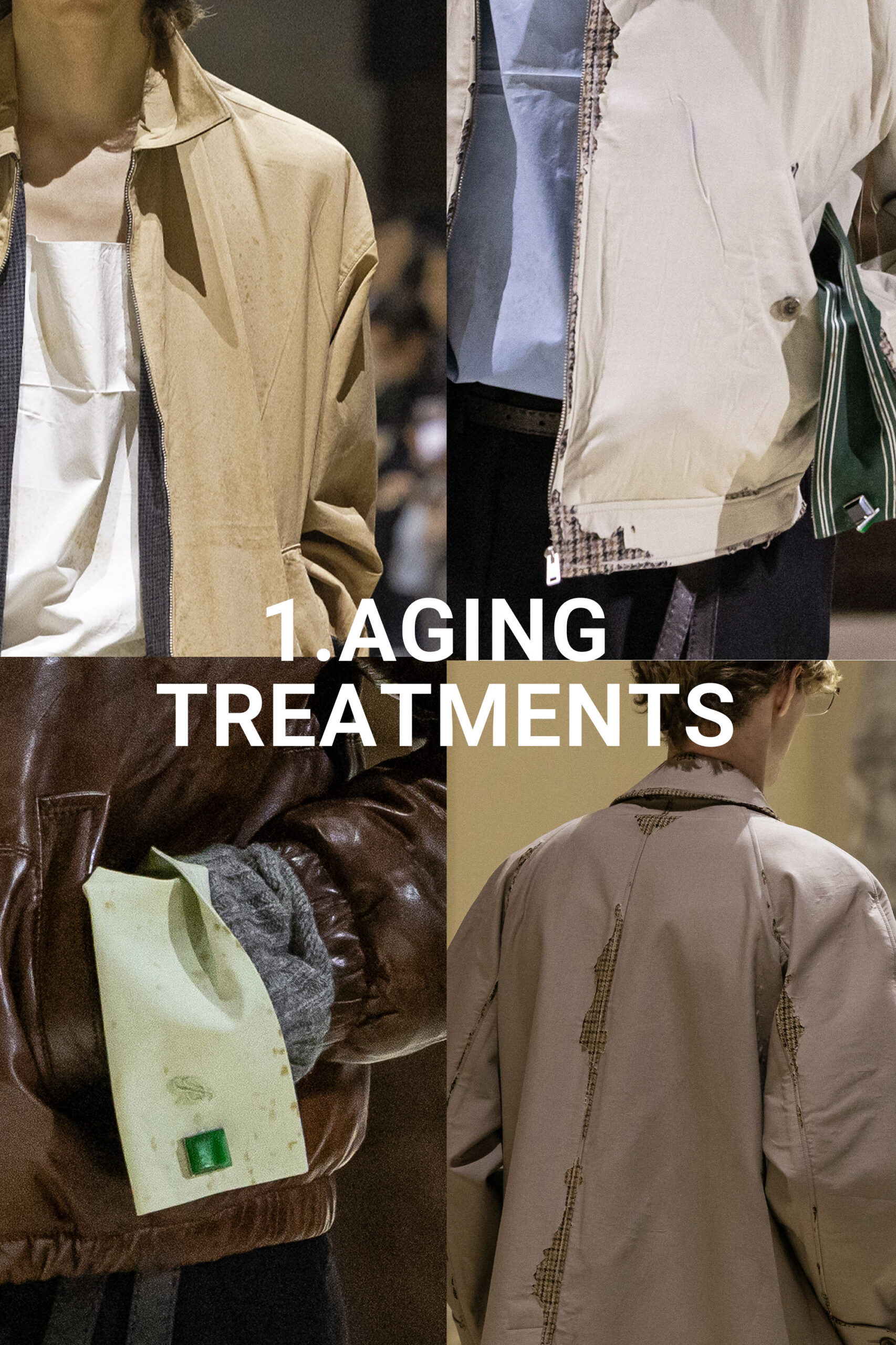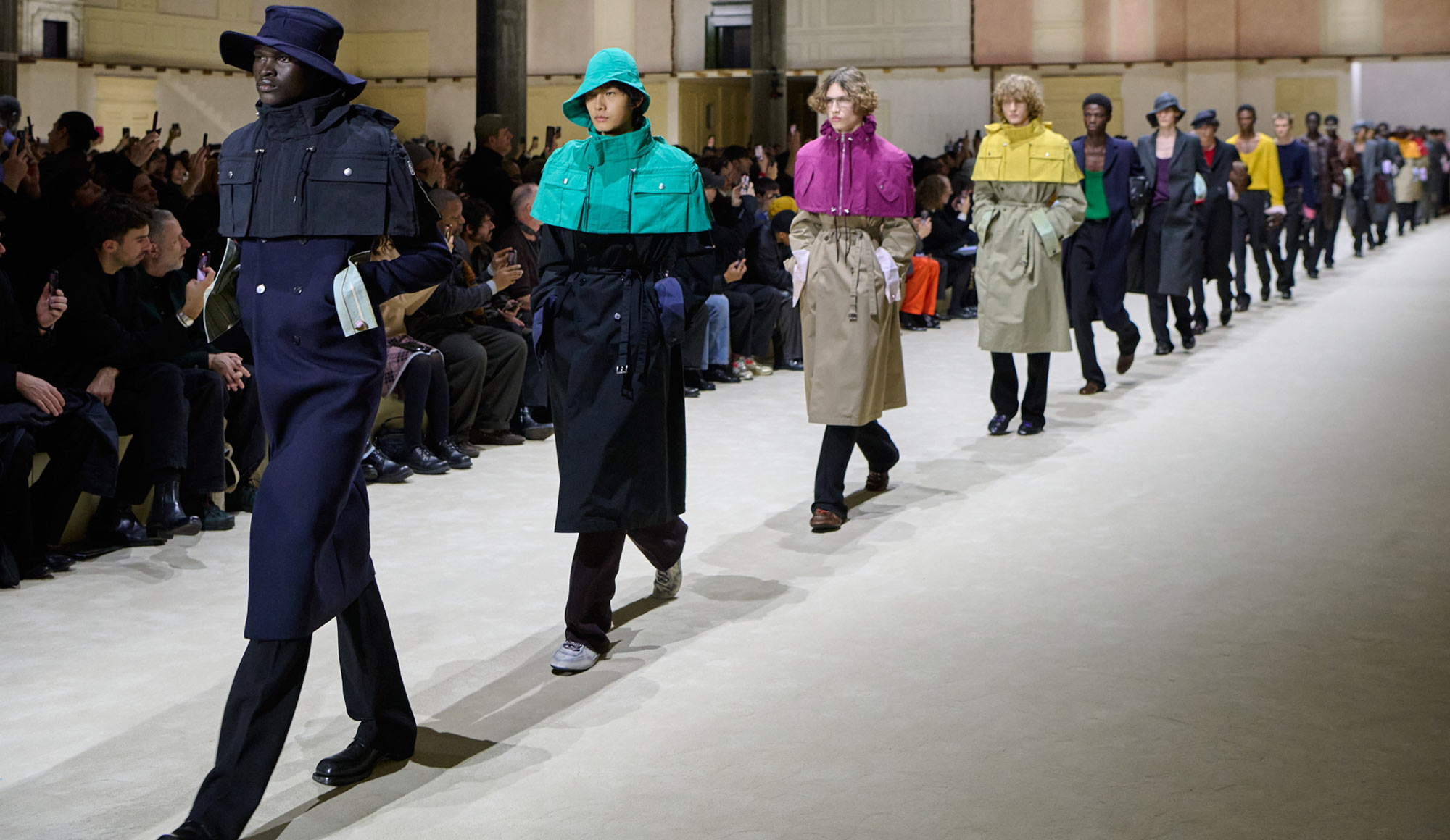A key item was the slim jacket, defined by an elongated and structured silhouette. It embodies traces of the wearer’s life, including personal attitudes and ways of living, translating this philosophy into form. While the overall look remained pared down and monochromatic, collage prints visualizing the overlap of different eras and meanings, combined with vividly colored pieces, created a strong contrast. Details such as folded shirt cuffs peeking from jacket sleeves, subtle aging treatments and bucket hats styled like corsages added a sense of quiet reassurance, subtly evoking the presence of lived experience.